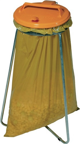 robustes, schlagfestes Stahlrohrgestell, Oberfläche galvanisch verzinkt · Kunststoffdeckel mit Klemmring zur Sackbefestigung · mit farbigem Deckel zur Wertstofftrennung · Einwurföffnung-Ø 335 mm · Weitere technische Eigenschaften Deckelausführung: Kunststoff