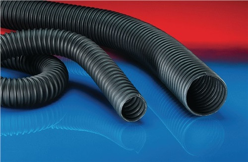 Anwendungen : flexibler Schlauch für heiße Gase, Abgasabsaugung, Absaugung von Motorabgasen: Abgasschlauchaufroller, Saugschlitzkanal, Überflurabsauganlage, Unterflurabsauganlage, Motorprüfstand, Abgasmessung Eigenschaften: gewebeverstärkt, hochflexibel + stauchbar, geschützte, strömungstechnisch optimierte Außenfaltung, vibrationsfest, überfahrbar + trittfest, gute Chemikalienbeständigkeit, RoHS konform Konstruktion : 1. spezial Kunststoffprofil Stützwendel, 2. gewebeverstärktes Band, Wandung: EPDM/ PP beschichtetes Gewebe, 3. Wandstärke ca. 0,4 mm Temperaturbereich : Abgastemperaturen bis 200 °C (bei korrekter Verwendung von Abgastrichtern und ausreichender Frischluftzufuhr (ca. 50%)) Liefervarianten : weitere Ausführungen, Abmessungen und Längen auf Anfrage lieferbar · Weitere technische Eigenschaften Biegeradius: 143mm