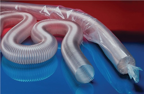 Anwendungen : flexibler Schlauch für Gase, abrasive Stäube, Pulver, Fasern, Absaug-, Entstaubungs- und Filteranlage, Ölnebel-, Farbdampf- und Chemiedampfabsaugung, Absaugarm, Gaspendelschlauch an Verladearm, explosionsgefährdeter Bereich, Tierstallbelüftung, Bus, Wohnwagen, Schiff, Yacht: Belüftung, Heizung, Reinraumbelüftung, Halbleiterfertigungsmaschine, Faltenbalg, Kompensator Eigenschaften : superleichte Ausführung, hochflexibel + stauchbar 3:1, abriebfest, mikrobenfest, gute Öl-, Benzin- und Chemikalienbeständigkeit, sehr gute Kälteflexibilität, schwerentflammbar nach: DIN 4102-B1, schwerentflammbar nach: UL94-HB, Wandung permanent antistatisch: Durchgangswiderstand und Oberflächenwiderstand  Konstruktion : 1. in der Wandung eingebetteter Federstahldraht, 2. Wandung: permanent-antistatisches Premium Ester-Polyurethan (Pre-PUR ® ), 3. Wandstärke ca. 0,4 mm Temperaturbereich: -40 °C bis 90 °C (kurzzeitig bis 125 °C)  Liefervarianten : weitere Ausführungen, Abmessungen und Längen auf Anfrage lieferbar ·  Weitere technische Eigenschaften Biegeradius: 88mm