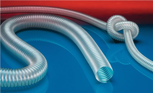 Antistatischer Lebensmittelschlauch und Pharmaschlauch, leicht, Edelstahldraht (INOX) Anwendungen: · flexibler Schlauch für Gase und für abrasive Stäube, Pulver, Fasern · Lebensmittelindustrie, Pharmaindustrie: Lebensmittel, Pharmazeutika · Förderung von z.B. Reis, trockene Lebensmittel, Getreideprodukte, Zucker, Milchpulver, Pulver, Kaffee, Tee, Getreide, Mehl, gefrorene Lebensmittel · Mischer, Trockner, Verpackungsmaschine, Big-Bag Befüllung und Entleerung, Mühle · Absaugarm · explosionsgefährdeter Bereich Eigenschaften: leichte und verstärkte Ausführung · hochflexibel + stauchbar 3:1 · abriebfest · Zulassung nach EU-Verordnung 10/2011 und der neuesten Verordnung 2015/174 durch ein unabhängiges Prüfinstitut für den gesamten Schlauch, Polyurethan lebensmittelecht nach: FDA 21 CFR 177.2600 · geruchs- und geschmacksfrei · mikroben- und hydrolysefest · gute Öl-, Benzin- und Chemikalienbeständigkeit · sehr gute Kälteflexibilität · Wandung permanent antistatisch: Durchgangswiderstand und Oberflächenwiderstand < 10⁹ Ω · gemäß TRGS 727 und ATEX 2014/34/EU: zur Aspiration brennbarer Stäube (Zone 22 im Inneren), zum Fördern für nicht brennbare Flüssigkeiten, zum Einsatz in Zone 1 und 2 (Gase) · RoHS konform Temperaturbereich: · -40°C bis 90°C