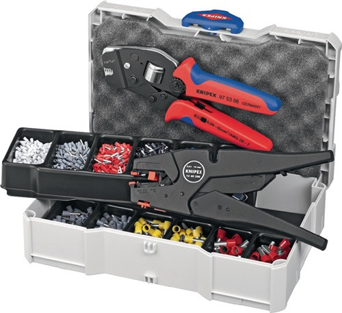 für Aderendhülsen im Mini-Systainer, 2 stapelbare Kunststoffeinsätze mit je 6 Mulden für Verbinder · mit einem Sortiment Aderendhülsen mit und ohne Kunststoffkragen Inhalt: Art.-Nr. 40 00 810 387: je 200 St. Aderendhülsen mit Kunststoffkragen 0,5 / 0,75 / 1,0 / 1,5 und 2,5 mm² je 100 St. Aderendhülsen mit Kunststoffkragen 4,0 und 6,0 mm² je 50 St. Aderendhülsen mit Kunststoffkragen 10,0 mm² 1 St. Automatik-Abisolierzange 200 mm, 0,03 - 10,0 mm² (40 00 810 426) 1 St. Aderendhülsenzange 190 mm, selbsteinstellend, 0,08-10,0 mm² (40 00 810 462) · Weitere technische Eigenschaften Verpackung: im Systainer • passend zu: für Aderendhülsen • Zubehör: Crimpzange, Abisolierzange