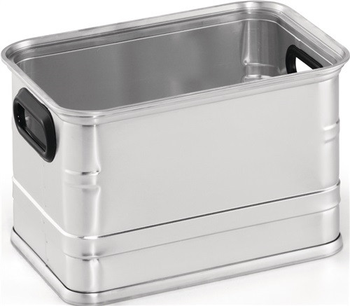 Transportbox Aluminium · robuste Bauweise, für einen vielfältigen Einsatz · formbeständig durch umlaufende Sicken · aus 0,8 mm starkem Aluminiumblech · mit großen kunststoffummantelten Grifföffnungen für ein einfaches und sicheres Handling · stapelbar und palettierbar · Weitere technische Eigenschaften Innenhöhe: 240mm • Innenlänge: 350mm • Innenbreite: 253mm