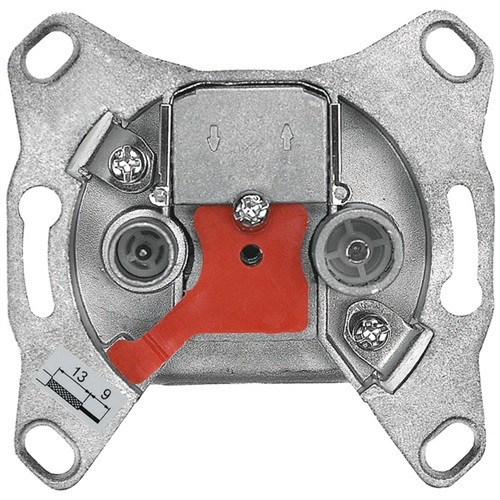 Durchgangsdose für Einzel-, GA/BK- und SAT-Anlagen · Breitbanddosen · rückkanaltauglich (5 - 30 / 5 - 65 MHz) · Anschlussdämpfung 14 dB(A) · Durchgangsdämpfung 1,5 / 2,3 dB(A) · Auskopplung in Doppelrichtkopplertechnik · mit 2 Ausgängen ·  Weitere technische Eigenschaften Einbau: Unterputz • Zubehör: ohne Rahmen • passend für: Einzel-, GA/BK- und SAT-Anlagen