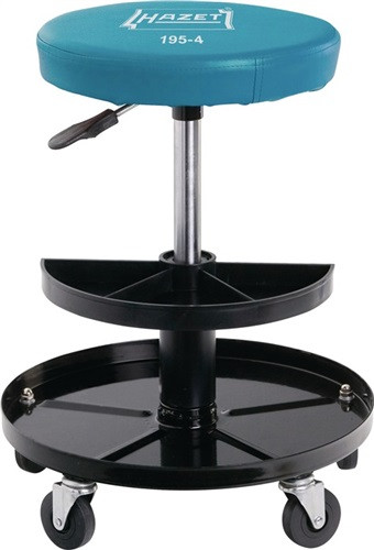 Für bequemen Sitz am Arbeitsplatz 5 Rollen (ca. 60 mm Durchmesser) Rollbarer Arbeits-Sitz, pneumatisch höhenverstellbar Mit gepolsterter Sitzfläche 320 mm Durchmesser, HAZET-blau Leicht zu reinigen Tragkraft: bis 150 kg Höhenverstellbar von 380 bis 510 mm 2 Werkzeug-Ablagen, 1 Ablage um 360° drehbar Kippsicher