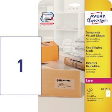 Geben Sie Ihren Aussendungen eine professionelle Note. Transparente Adress-Etiketten von Avery Zweckform helfen Ihnen dabei! Die Folienetiketten sind nach dem Aufkleben nahezu unsichtbar. Dank der kostenlosen Avery Zweckform Vorlagen und Software-Lösungen können Sie die Etiketten schnell und einfach gestalten und drucken! · Maße: 210 x 297 mm (B x H) · wieder ablösbar: Nein · Werkstoff: Polyester · Verwendung für Papierformat: Paket, Päckchen · Verwendung für Druck- oder Schreibgerät: Laserdrucker, Farblaserdrucker · selbstklebend: Ja · abgerundete Ecken vorhanden: Nein · Farbe: transparent · Ausführung des Etikettenträgers: A4-Blatt · Anzahl der Etiketten je Packung: 25 Etik./Pack. · Anzahl der Etiketten je Blatt: 1 Etik./Bl. · Anzahl der Blätter je Packung: 25 Bl./Pack. · umlaufender Rand vorhanden: Ja