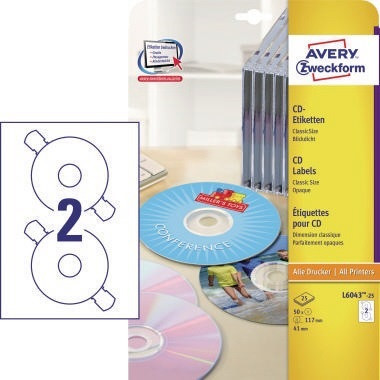 Erstellen Sie professionell gestaltete CDs mit den CD-Etiketten von Avery Zweckform. Die CD-Aufkleber sind mit praktischen Haltelaschen ausgestattet, die ein einfaches und mittiges Aufbringen ermöglichen. Dank der kostenlosen Avery Zweckform Vorlagen und Software-Lösungen können Sie die Etiketten schnell und einfach gestalten und drucken! · umlaufender Rand vorhanden: Ja · Zentrierhilfe vorhanden: Nein · Verwendung für Druck- oder Schreibgerät: Laserdrucker, Farblaserdrucker, Inkjetdrucker, Kopierer · Typbezeichnung des Lochdurchmessers: Classic Size · selbstklebend: Ja · freier Inhalt: 25 Bl./Pack. · Forest Stewardship Council (FSC): Ja · Farbe: weiß · Durchmesser des Innenlochs: 41 mm · blickdicht: Ja · Ausführung des Etikettenträgers: A4-Blatt · Ausführung der Oberflächenbeschaffenheit: matt · Anzahl der Blätter je Packung: 25 Bl./Pack. · Anzahl der Etiketten je Packung: 50 Etik./Pack. · Anzahl der Etiketten je Blatt: 2 Etik./Bl. · Durchmesser: 117 mm · Werkstoff: Papier
