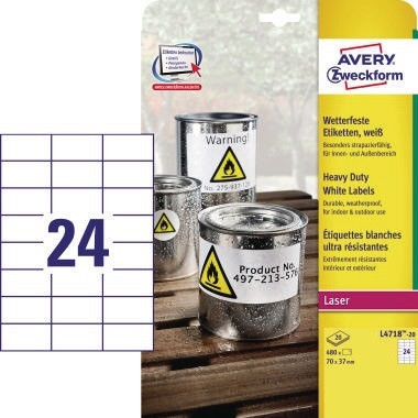 Die wetterfesten Folien-Etiketten sind ideal für strapazierfähige Beschriftungen, Markierungen und Schilder. Bedrucken Sie Ihre Etiketten mit der benutzerfreundlichen Software und anwendungsfreundlichen Druckvorlagen - kostenloser Download unter www.avery-zweckform.eu.