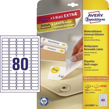 Die wiederablösbaren Universal-Etiketten von Avery Zweckform lassen sich mit allen gängigen Druckern und Kopierern bedrucken und garantieren einen staufreien Druckerdurchlauf. Diese Aufkleber bieten Ihnen für jeden Bedarf und Anwendungsbereich die passende Lösung und sind rückstandsfrei wiederablösbar. Kostenlose Software und Vorlagen finden Sie unter www.avery-zweckform.eu/print. · Ausführung des Etikettenträgers: A4-Blatt · Werkstoff: Papier · Verwendung für Druck- oder Schreibgerät: Laserdrucker, Farblaserdrucker, Inkjetdrucker, Kopierer · umlaufender Rand vorhanden: Ja · Maße: 35,6 x 16,9 mm (B x H) · wieder ablösbar: Ja · Forest Stewardship Council (FSC): Ja · Anzahl der Etiketten je Packung: 2.000 Etik./Pack. · Anzahl der Etiketten je Blatt: 80 Etik./Bl. · Anzahl der Blätter je Packung: 25 Bl./Pack. · abgerundete Ecken vorhanden: Ja · Farbe: weiß · Ausführung des Papiertyps: chlorfrei gebleicht