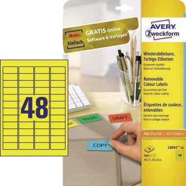 Farbige Mini-Etiketten verleihen Ihren Beschriftungen mehr Aufmerksamkeit. Ideal für Beschriftungen im extra Small Kleinformat. Sparen Sie Zeit mit anwendungsfreundlichen Druckvorlagen und benutzerfreundlicher Software - kostenloser Download unter www.avery-zweckform.eu · Ausführung des Etikettenträgers: A4-Blatt · wieder ablösbar: Ja · Werkstoff: Papier · Verwendung für Druck- oder Schreibgerät: Laserdrucker, Farblaserdrucker, Inkjetdrucker, Kopierer · umlaufender Rand vorhanden: Ja · Farbe: gelb · Anzahl der Etiketten je Packung: 960 Etik./Pack. · Anzahl der Etiketten je Blatt: 48 Etik./Bl. · Anzahl der Blätter je Packung: 20 Bl./Pack. · abgerundete Ecken vorhanden: Ja · Maße: 45,7 x 21,2 mm (B x H)