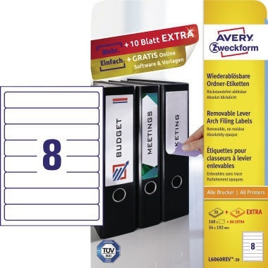 Gestalten und bedrucken Sie Ihre Ordnerrücken schnell und einfach - mit den kostenlosen Avery Zweckform Etiketten Vorlagen und Software-Lösungen unter www.avery-zweckform.eu/print oder den im Microsoft® Office Paket integrierten Basis-Vorlagen. · Anzahl der Blätter je Packung: 20 Bl./Pack. · Klebemasse lösungsmittelfrei: Ja · Maße: 34 x 192 mm (B x H) · selbstklebend: Ja · umlaufender Rand vorhanden: Ja · Verwendung für Druck- oder Schreibgerät: Inkjetdrucker, Laserdrucker, Farblaserdrucker, Kopierer · wieder ablösbar: Ja · Forest Stewardship Council (FSC): Ja · Werkstoff: Papier · Farbe: weiß · blickdicht: Ja · Ausführung des Papiertyps: chlorfrei gebleicht · Ausführung des Etikettenträgers: A4-Blatt · Aufdruck vorhanden: Nein · Anzahl der Etiketten je Packung: 160 Etik./Pack. · Anzahl der Etiketten je Blatt: 8 Etik../Pack. · Format des Schildes: schmal/kurz · Griffloch vorhanden: Nein