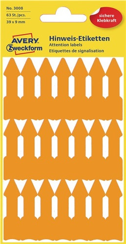 Das sticht ins Auge! Kennzeichnen Sie wichtige Textpassagen mit den vorgedruckten Etiketten in Sonderformaten von Avery Zweckform. Der leuchtrote Hinweispfeil fällt garantiert jedem sofort auf und Sie können sicher sein, dass die Information nicht mehr verloren geht. Die Richtungspfeile eignen sich auch zur Kennzeichnung wichtiger Orte auf Landkarten. · Farbe: leuchtrot · wieder ablösbar: Nein · Werkstoff: Papier · Sonderform: Pfeil · Maße: 39 x 9 mm (B x H) · Höhe des Blattes: 120 mm · Breite: 39 mm · Breite des Blattes: 79 mm · Ausführung der Haftung: Stark · Anzahl der Etiketten je Packung: 63 Etik./Pack. · Anzahl der Etiketten je Blatt: 21 Etik./Bl. · Anzahl der Blätter je Packung: 3 Bl./Pack. · Höhe: 9 mm