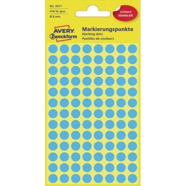 Ideal zum Kennzeichnen, Beschriften, Markieren und Hinweisen Schaffen blitzschnell Ordnung und Übersicht auf Ordnern, Akten, Unterlagen, Karteikarten etc. · Werkstoff: Papier · wieder ablösbar: Nein · umlaufender Rand vorhanden: Nein · selbstklebend: Ja · Klebemasse lösungsmittelfrei: Nein · Höhe des Blattes: 120 mm · Durchmesser: 8 mm · Breite des Blattes: 76 mm · Ausführung des Papiertyps: chlorfrei gebleicht · Anzahl der Etiketten je Packung: 416 Etik./Pack. · Anzahl der Blätter je Packung: 4 Bl./Pack. · Anzahl der Etiketten je Blatt: 104 Etik./Bl. · Farbe: blau