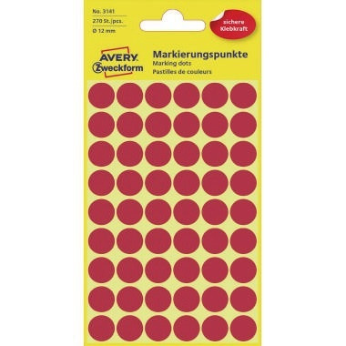 Ideal zum Kennzeichnen, Beschriften, Markieren und Hinweisen schaffen blitzschnell Ordnung und Übersicht auf Ordnern, Akten, Unterlagen, Karteikarten etc. · Farbe: rot · wieder ablösbar: Nein · Werkstoff: Papier · umlaufender Rand vorhanden: Nein · selbstklebend: Ja · Höhe des Blattes: 120 mm · Durchmesser: 12 mm · Breite des Blattes: 78 mm · Anzahl der Etiketten je Packung: 270 Etik./Pack. · Anzahl der Etiketten je Blatt: 90 Etik./Bl. · Anzahl der Blätter je Packung: 5 Bl./Pack. · Klebemasse lösungsmittelfrei: Nein