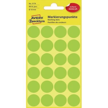 Ideal zum Kennzeichnen, Beschriften, Markieren und Hinweisen schaffen blitzschnell Ordnung und Übersicht auf Ordnern, Akten, Unterlagen, Karteikarten etc. · Farbe: leuchtgrün · wieder ablösbar: Nein · Werkstoff: Papier · umlaufender Rand vorhanden: Nein · selbstklebend: Ja · Höhe des Blattes: 120 mm · Durchmesser: 18 mm · Breite des Blattes: 78,5 mm · Anzahl der Etiketten je Packung: 96 Etik./Pack. · Anzahl der Etiketten je Blatt: 24 Etik./Bl. · Anzahl der Blätter je Packung: 4 Bl./Pack. · Klebemasse lösungsmittelfrei: Ja