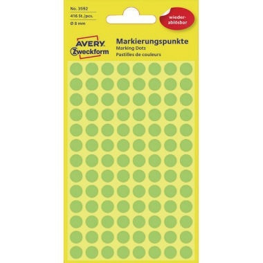 Ideal zum Kennzeichnen, Beschriften, Markieren und Hinweisen Schaffen blitzschnell Ordnung und Übersicht auf Ordnern, Akten, Unterlagen, Karteikarten etc. · Durchmesser: 8 mm · wieder ablösbar: Ja · Werkstoff: Papier · umlaufender Rand vorhanden: Nein · selbstklebend: Ja · Klebemasse lösungsmittelfrei: Nein · Farbe: grün · Breite des Blattes: 76 mm · Ausführung des Papiertyps: chlorfrei gebleicht · Anzahl der Etiketten je Packung: 416 Etik./Pack. · Anzahl der Etiketten je Blatt: 104 Etik./Bl. · Anzahl der Blätter je Packung: 4 Bl./Pack. · Höhe des Blattes: 120 mm