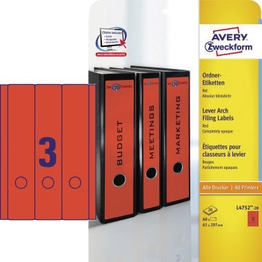 Halten Sie Ordnung in Ihren Unterlagen mit bedruckbaren Ordner-Etiketten. Durch das blickdichte Material können Sie alte Ordner erneut verwenden. Die alte Beschriftung scheint nicht durch. Die Rückenschilder lassen sich mit allen gängigen Druckern und Kopierern bedrucken. Gestalten und bedrucken Sie die Ordner-Etiketten mit unserer kostenlosen und benutzerfreundlichen Software. · Format des Schildes: breit/lang · Griffloch vorhanden: Ja · Klebemasse lösungsmittelfrei: Ja · Maße: 61 x 297 mm (B x H) · Packungsmenge: 60 Etik./Pack. · selbstklebend: Ja · Verwendung für Druck- oder Schreibgerät: Inkjetdrucker, Laserdrucker, Farblaserdrucker, Kopierer · Werkstoff: Papier · Anzahl der Etiketten je Blatt: 3 Etik./Bl. · Anzahl der Blätter je Packung: 20 Bl./Pack. · Forest Stewardship Council (FSC): Ja · Anzahl der Etiketten je Packung: 60 Etik./Pack. · Aufdruck vorhanden: Nein · Ausführung des Etikettenträgers: A4-Blatt · blickdicht: Ja · Farbe: rot