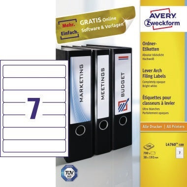 Halten Sie Ordnung in Ihren Unterlagen mit bedruckbaren Ordner-Etiketten. Durch das blickdichte Material können Sie alte Ordner erneut verwenden. Die alte Beschriftung scheint nicht durch. Die Rückenschilder lassen sich mit allen gängigen Druckern und Kopierern bedrucken. Gestalten und bedrucken Sie die Ordner-Etiketten mit unserer kostenlosen und benutzerfreundlichen Software. · Format des Schildes: schmal/kurz · Werkstoff: Papier · Verpackung: Packung · selbstklebend: Ja · Packungsmenge: 700 Etik./Pack. · Maße: 38 x 192 mm (B x H) · Klebemasse lösungsmittelfrei: Ja · Griffloch vorhanden: Nein · Verwendung für Druck- oder Schreibgerät: Inkjetdrucker, Laserdrucker, Farblaserdrucker, Kopierer · Anzahl der Blätter je Packung: 100 Bl./Pack. · Farbe: weiß · blickdicht: Ja · Ausführung des Papiertyps: chlorfrei gebleicht · Ausführung des Etikettenträgers: A4-Blatt · Aufdruck vorhanden: Nein · Anzahl der Etiketten je Packung: 700 Etik./Pack. · Forest Stewardship Council (FSC): Ja · Anzahl der Etiketten je Blatt: 7 Etik./Bl.