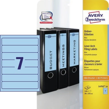 Halten Sie Ordnung in Ihren Unterlagen mit bedruckbaren Ordner-Etiketten. Die alte Beschriftung scheint nicht durch. Die Rückenschilder lassen sich mit allen gängigen Druckern und Kopierern bedrucken. Gestalten und bedrucken Sie die Ordner-Etiketten mit unserer kostenlosen und benutzerfreundlichen Software. www.avery-zweckform.eu/print. · Forest Stewardship Council (FSC): Nein · Format des Schildes: schmal/kurz · Verpackung: Packung · selbstklebend: Ja · Packungsmenge: 140 Etik./Pack. · Maße: 38 x 192 mm (B x H) · Klebemasse lösungsmittelfrei: Ja · Verwendung für Druck- oder Schreibgerät: Inkjetdrucker, Laserdrucker, Farblaserdrucker, Kopierer · Anzahl der Etiketten je Blatt: 7 Etik./Bl. · Griffloch vorhanden: Nein · Anzahl der Blätter je Packung: 20 Bl./Pack. · Werkstoff: Papier · Anzahl der Etiketten je Packung: 140 Etik./Pack. · Aufdruck vorhanden: Nein · Ausführung des Etikettenträgers: A4-Blatt · blickdicht: Ja · Farbe: blau