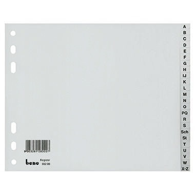 Strapazierfähig. · Ausführung des Registers: halbe Höhe · Anzahl der Registerblätter: 24 Registerblätter · Verwendung für Papierformat: DIN A4 · Stärke: 0,12 mm · Farbe: grau · Werkstoff: Polypropylen · Ausführung der Tabe: A-Z · Ausführung der Lochung: Universallochung · Maße: 22,5 x 18 cm (B x H)