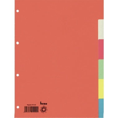 Bene Ordnerregister DIN A4 blanko Recyclingkarton mehrfarbig 6 Registerblätter · Ausführung des Registers: volle Höhe · Werkstoff: Recyclingkarton · Verwendung für Papierformat: DIN A4 · Maße: 22,5 x 30 cm (B x H) · Farbe: farbig sortiert · Ausführung der Tabe: blanko · Ausführung der Lochung: 4fach Lochung · Anzahl der Registerblätter: 6 Registerblätter · Grammatur: 230 g/m²