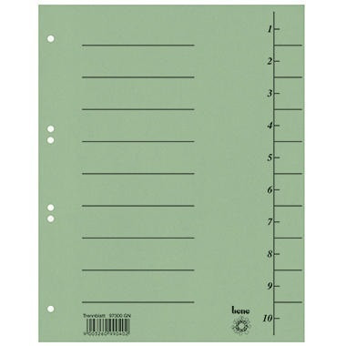 Die Taben können in verschiedenen Längen ausgeschnitten werden. · Farbe: grün · Verwendung für Papierformat: DIN A4 · Maße: 23,5 x 30 cm (B x H) · Linienaufdruck vorhanden: Ja · Werkstoff: Karton · Breite: 235 mm · Ausführung der Tabe: blanko · Ausführung der Lochung: Universallochung · Anzahl der Tabe: 10 Taben · Höhe: 300 mm · Grammatur: 250 g/m²