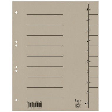 Die Taben können in verschiedenen Längen ausgeschnitten werden. · Farbe: grau · Werkstoff: Karton · Verwendung für Papierformat: DIN A4 · Maße: 23,5 x 30 cm (B x H) · Linienaufdruck vorhanden: Ja · Grammatur: 250 g/m² · Breite: 235 mm · Ausführung der Tabe: blanko · Ausführung der Lochung: Universallochung · Anzahl der Tabe: 10 Taben · Höhe: 300 mm