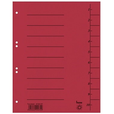 Die Taben können in verschiedenen Längen ausgeschnitten werden. · Farbe: rot · Verwendung für Papierformat: DIN A4 · Maße: 23,5 x 30 cm (B x H) · Linienaufdruck vorhanden: Ja · Werkstoff: Karton · Breite: 235 mm · Ausführung der Tabe: blanko · Ausführung der Lochung: Universallochung · Anzahl der Tabe: 10 Taben · Höhe: 300 mm · Grammatur: 250 g/m²