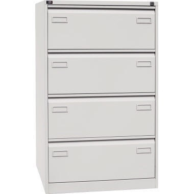 Leichtgängige Laufschienen, doppelbahnig, geschweißte Konstruktion, geschlossener Wannenboden, Etikettenfenster, 200 unterschiedliche Schlossnummern. · Garantie gewährt: Ja · Verwendung für Papierformat: DIN A4 · Werkstoff: Stahl · Tragfähigkeit der Schublade: 50 kg · Schließung vorhanden: Ja · Maße: 80 x 132,1 x 62,2 cm (B x H x T) · Garantiedauer: 5 Jahre · Form des Griffes: Griffmulde · Farbe: lichtgrau · Auszugsperre vorhanden: Ja · Art des Auszuges: Vollauszug · Art der Schubladenführung: kugelgelagert · Anzahl der Bahnen: 2-bahnig · Anzahl der Hängeregistraturen: 4 Hängeregistraturen