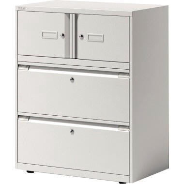 Der Kombinationsschrank bietet in 2 einzeln abschließbaren Fächern Raum für die sichere Ablage von Unterlagen oder privaten Dingen im Büro. Die Türen sind zur individuellen Beschriftung mit Etikettenhaltern ausgestattet. In den 2 einzeln abschließbaren Schubladen ist jeweils Platz für A4 Hängemappen und Aktenordner. Pro Schubladen können Sie A4 Hängemappen quer oder 2 Bahnen in Front ausrichten. Die Schubladen laufen leise auf leichtgängigen Schienen und sind mit einem geschlossenen Boden und Doppelauszugssperre ausgestattet. Etikettenfenster ermöglichen die Identifikation des Inhalts. Die Türen und Schubladen sind jeweils einzeln abschließbar. Unterschiedliche Schließungen. Mit Höhenausgleichsfüßen zum Ausgleich von eventuellen Bodenunebenheiten. Robuster geschweißter Korpus.