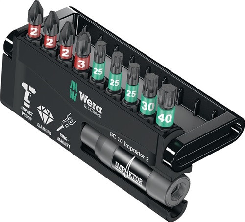für härteste Schraubbedingungen und Impakt-Schrauber-Maschinen · die Wera IMPAKTOR-Technologie sorgt durch bestmögliche Ausnutzung der Materialeigenschaften und durch optimal angepasste Geometrien für überdurchschnittliche Standzeiten auch bei extremen Anforderungen · besonders geeignet für den Einsatz mit handelsüblichen Impakt-/Schlagschraubern · die raue Diamantbeschichtung reduziert durch erhöhten Reibungswiderstand das Herausrutschen aus der Schraube Besonderer Produktvorteil: Take it easy Tool Finder System Inhalt: 1 Bit-Halter IMPAKTOR mit Ringmagnet und Sprengring (75 mm lang) Bits für Schrauben mit Kreuzschlitz (PH) Impaktor Bits diamantbeschichtet: 3 St. Gr. 2* Impaktor Bit diamantbeschichtet: 1 St. Gr. 3* Bits für Schrauben mit Innen-TORX®-Profil Impaktor Bits diamantbeschichtet: 3 St. Gr. T 25* Impaktor Bit diamantbeschichtet: 1 St. Gr. T 30* Impaktor Bit diamantbeschichtet: 1 St. Gr. T 40* * jeweils 25 mm lang · Weitere technische Eigenschaften Lieferung: in Kunststoffbox