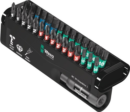 bestückt mit IMPAKTOR Bits diamantbeschichtet IMPAKTOR Bits für härteste Schraubbedingungen für Impakt-Schrauber-Maschinen · IMPAKTOR-Technologie sorgt durch bestmögliche Ausnutzung der Materialeigenschaften und durch optimal angepasste Geometrien für überdurchschnittliche Standzeiten auch bei extremen Anforderungen · besonders geeignet für den Einsatz mit handelsüblichen Impakt-/Schlagschraubern · die raue Diamantbeschichtung reduziert durch erhöhten Reibungswiderstand das Herausrutschen aus der Schraube Besonderer Produktvorteil: Take it easy Tool Finder System Inhalt: 1 IMPAKTOR Bit-Halter mit Ringmagnet und Sprengring (75 mm lang) Bits für Schrauben mit Kreuzschlitz (PH), 2 St. Gr. 1, 3 St. Gr. 2, 2 St. Gr. 3* *= Bitlänge jeweils 25 mm Bits für Schrauben mit Kreuzschlitz (PZD), 2 St. Gr. 1 , 3 St. Gr. 2, 2 St. Gr. 3* *= Bitlänge jeweils 25 mm Bits für Schrauben mit Innen-TORX®-Profi, 1 St. Gr. T 10, 1 St. Gr. T 15, 2 St. Gr. T 20, 3 St. Gr. T 25, 2 St. Gr. T 30, 2 St. Gr. T 40* *= Bitlänge jeweils 25 mm Bits für Schrauben mit Innensechkant-Profil, Gr. 3 - 4 - 5 - 6 mm* *= Bitlänge jeweils 25 mm · Weitere technische Eigenschaften Lieferung: in Kunststoffbox