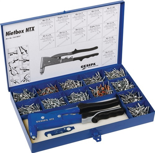 mit Handnietzange NTX (Art.-Nr. 40 00 813 032) · mit 3 Mundstücken: 10/18, 10/24 und 10/32 · Weitere technische Eigenschaften Breite: 205mm • Länge: 340mm • Verpackung: i.Blechkoffer • Höhe: 40mm