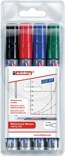 Rundspitze · geruchsarme Tusche (auf Alkoholbasis) · nachfüllbar · zum Beschriften von Schreibtafeln · trocken abwischbar von fast allen geschlossenen Oberflächen Cap-Off-Tusche: Bis zu einigen Tagen offen lagerfähig, ohne einzutrocknen · Set-Ausführung Etui mit 4 Farben (je 1 x schwarz, rot, blau, grün), VE = 1 Etui, Farbig sortiert