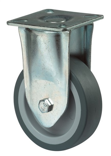 Gehäuse aus Stahlblech, verzinkt-chromatiert · korrosionsunempfindlich · thermoplastische Gummibereifung (blaugrau) auf Kunststoff-Felge · Gleitlager · Befestigung mit Anschraubplatte · Weitere technische Eigenschaften Oberfläche Gehäuse: verzinkt-chromatiert • Befestigungsart: mit Anschraubplatte • Bauhöhe: 73mm • Arbeitstemperatur: -10 - 60°C • Material Gehäuse: Stahlblech • Plattenlänge: 54mm