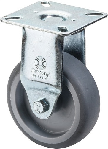 Gehäuse aus Stahlblech, verzinkt-chromatiert · korrosionsunempfindlich · zweireihiger Kugelkranz im Gabelkopf · thermoplastische Gummibereifung (grau) auf Kunststoff-Felge · Gleitlager · Befestigung mit Anschraubplatte · Weitere technische Eigenschaften Oberfläche Gehäuse: verzinkt-chromatiert • Befestigungsart: mit Anschraubplatte • Bauhöhe: 73mm • Material Gehäuse: Stahlblech • Plattenlänge: 54mm
