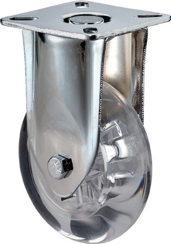 Gabel aus Stahlblech verchromt · Rad Kunststoff transparent, Gleitlager · mit Plattenbefestigung · Weitere technische Eigenschaften Oberfläche Gehäuse: verzinkt-chromatiert • Befestigungsart: mit Anschraubplatte • Bauhöhe: 103mm • Arbeitstemperatur: -30 - 80°C • Material Gehäuse: Stahlblech • Plattenlänge: 60mm