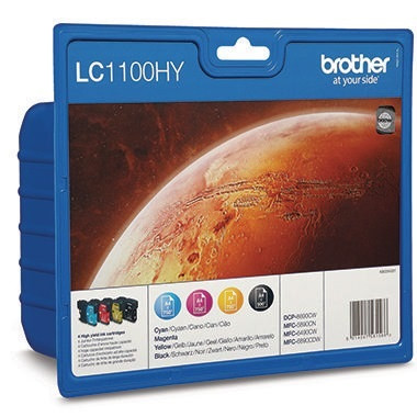 Brother Tintenpatrone LC1100HYVALBPDR ca. 1 x 900 Seiten schwarz, ca. 3 x 750 Seiten farbig schwarz, mehrfarbig 4 St./Pack. · Garantie gewährt: Nein · Zertifikat/Zulassung: Blauer Engel · Verwendung für Gerätetyp: Inkjetdrucker · Verwendung für Druckertyp: DCP 6690CW, MFC 5890CN, -5895CW, -6490CW, -6890CDW · Typbezeichnung der Verbrauchsmittelgruppe: LC1100HYVALBPDR · refill: Nein · Originalzubehör: Ja · nachfüllbar: Nein · Kapazität geprüft gemäß: ISO/IEC 24711 · Farbe: schwarz, cyan, magenta, gelb · dokumentenecht: Ja · DIN-Norm vorhanden: Nein · Blauer Engel: Ja · Ausführung des Inhalts (Packung): 4 St./Pack. · Ausführung der Farbe: schwarz, mehrfarbig · max. Anzahl der Druckseiten: ca. 900 Seiten schwarz, 3 x 750 Seiten farbig