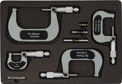 Spindel gehärtet · Gewinde geschliffen · Ableseteile mattverchromt · Messflächen Hartmetall · mit Isolierschale und Gefühlsratsche · Spindel-Ø 6,5 mm · 0,5 mm Steigung · Satz bestehend aus: je 1 Bügelmessschraube 0-25, 25-50, 50-75 und 75-100 mm, 3 Einstellmaße · Weitere technische Eigenschaften Steigung: 0,5mm