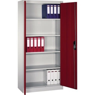 Büroschrank. Türen verstärkt für hohe Stabilität, Aufhängung oben und unten in Drehbolzen, zueinanderschlagend für gemeinsamen Verschluss. Muldengriff Ergo-Lock. 3-Riegel-Verschluss.
