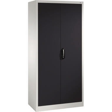Büroschrank. Türen verstärkt für hohe Stabilität, Aufhängung oben und unten in Drehbolzen, zueinanderschlagend für gemeinsamen Verschluss. Muldengriff Ergo-Lock. 3-Riegel-Verschluss.