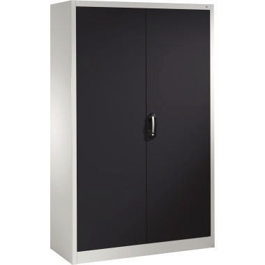 Büroschrank. Türen verstärkt für hohe Stabilität, Aufhängung oben und unten in Drehbolzen, zueinanderschlagend für gemeinsamen Verschluss. Muldengriff Ergo-Lock. 3-Riegel-Verschluss.