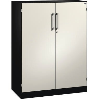 Aktensideboard mit Korpus in filigraner Kantenoptik, auf frontbündigem Sockel mit integrierter Niveauregulierung, bequem von innen bedienbar. Türen doppelwandig, gedämmt für angenehmes Geräuschverhalten. Türaufhängung in innen liegenden Scharnieren mit großzügigem Öffnungswinkel, zueinanderschlagend für gemeinsamen Verschluss.