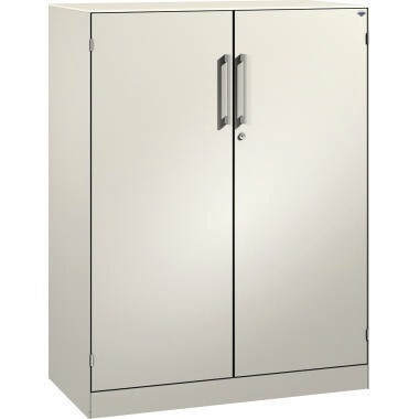 Aktensideboard mit Korpus in filigraner Kantenoptik, auf frontbündigem Sockel mit integrierter Niveauregulierung, bequem von innen bedienbar. Türen doppelwandig, gedämmt für angenehmes Geräuschverhalten. Türaufhängung in innen liegenden Scharnieren mit großzügigem Öffnungswinkel, zueinanderschlagend für gemeinsamen Verschluss.