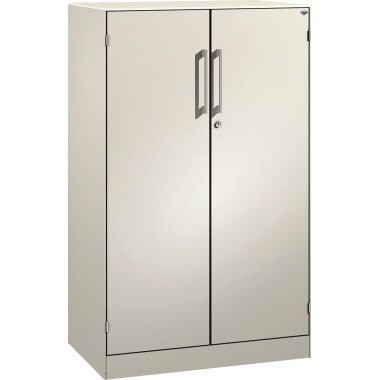 Aktensideboard mit Korpus in filigraner Kantenoptik, auf frontbündigem Sockel mit integrierter Niveauregulierung, bequem von innen bedienbar. Türen doppelwandig, gedämmt für angenehmes Geräuschverhalten. Türaufhängung in innen liegenden Scharnieren mit großzügigem Öffnungswinkel, zueinanderschlagend für gemeinsamen Verschluss.