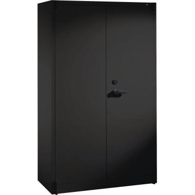 Feuergeschützter Flügeltürenschrank. Gedämmt. Zwischen den Wandungen 25 mm starke Spezial-Isolierplatten Klasse A1. Türaufhängung oben und unten in stabilen Drehbolzen, großzügiger Öffnungswinkel, zueinanderschlagend für gemeinsamen Verschluss. Erhöhte Einbruchsicherheit durch stabile Türsicherungen, die links und rechts in die Seitenwände einrasten. Verriegelung über 5-riegliges Bolzenriegelwerk (seitlich 3 x, oben/unten je 1 x). Robuster Schrankgriff.