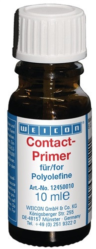 für Cyanacrylatklebstoffe · viele Kunststoffe lassen sich ohne vorherige Behandlung nicht bzw. nur bedingt verkleben · durch die Vorbehandlung dieser Kunststoffe mit WEICON Contact Primer wird eine Veränderung der sonst nur schwer verklebbaren Kunststoffe, z. B. Polyethylen (PE) und Polypropylen (PP) aus der Gruppe der Polyolefine, ermöglicht · auch moderne thermoplastische Elastomere (TPE), Teflon® und damit verwandte Kunststoffe sowie Silicone lassen sich nach Vorbehandlung mit WEICON Contact Primer verkleben · Vorteile: größere Auswahl von verwendbaren Kunststoffen, höhere Festigkeiten bei sonst schwer zu verklebenden Kunststoffen, Kostenersparnis durch Wegfall anderer mechanischer Vorbehandlungsmethoden (Korona, Niederdruckplasma, Beflammung etc.) · schnelle und einfache Anwendung · die Wirksamkeit beginnt ca. 2 Minuten nach Auftrag und bleibt bis ca. 24 Stunden erhalten · Weitere technische Eigenschaften Einsatzbereich: Verklebung Polyolefine (z.B. PE, PP)