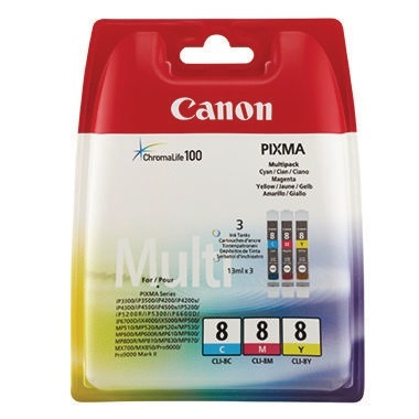 Originaltinten von Canon sorgen für maximale Qualität, lang anhaltende Farbstabilität und Zuverlässigkeit bei Ihrem Drucker oder Multifunktionssystem. · Originalzubehör: Ja · Kapazität geprüft gemäß: ISO/IEC 24711 · Verwendung für Druckertyp: PIXMA iP 6600D, -3300, -4200, -4300, -5200, -5200R, -5300, i · refill: Nein · Verwendung für Gerätetyp: Inkjetdrucker · nachfüllbar: Nein · max. Anzahl der Druckseiten: ca. 3 x 50 Seiten farbig · Garantie gewährt: Nein · Farbe: cyan, magenta, gelb · dokumentenecht: Nein · DIN-Norm vorhanden: Nein · Ausführung des Inhalts (Set): 3 St./Pack. · Ausführung des Inhalts (Packung): 3 St./Pack. · Ausführung der Farbe: mehrfarbig · Typbezeichnung der Verbrauchsmittelgruppe: CLI8 · Inhalt: 3 x 13 ml