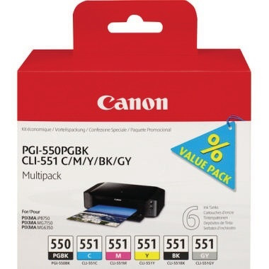 Canon Tintenpatrone PGI550/CLI551 ca. 2 x 300 Seiten schwarz, 4 x 330 Seiten farbig mehrfarbig 6 St./Pack. · Ausführung des Inhalts (Packung): 6 St./Pack · Farbe: mehrfarbig · freier Inhalt: 1 x 22 ml schwarz, 3 x 11 ml farbig · max. Anzahl der Druckseiten: ca. 2 x 300 Seiten schwarz, 4 x 330 Seiten farbig · Typbezeichnung der Verbrauchsmittelgruppe: PGI550/CLI551 · Verwendung für Druckertyp: Canon Pixma MG 6300 Serie, -7100 Serie, -7500 Serie, -IP 870 · Verwendung für Gerätetyp: Inkjetdrucker · Ausführung der Farbe: schwarz, cyan, magenta, gelb, grau