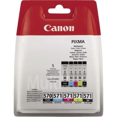 Canon Tintenpatrone PGI570/CLI571 ca. 1 x 300 Seiten schwarz, ca. 1 x 374 Seiten schwarz, ca. 1 x 345 Seiten cyan, ca. 1 x 306 Seiten magenta, ca. 1 x 347 Seiten gelb schwarz, mehrfarbig 5 St./Pack. · Originalzubehör: Ja · max. Anzahl der Druckseiten: ca. 1 x 520 Seiten schwarz, 1 x 500 Seiten schwarz, 3 x 715 · Verwendung für Gerätetyp: Inkjetdrucker · Verwendung für Druckertyp: PIXMA MG 5750, -5751, -5752, -5753, -6850, -6851, -6852, -68 · freier Inhalt: 5 x 7 ml · Ausführung der Farbe: schwarz, mehrfarbig · Farbe: schwarz, cyan, magenta, gelb · Ausführung des Inhalts (Packung): 5 St./Pack · Typbezeichnung der Verbrauchsmittelgruppe: CLI571