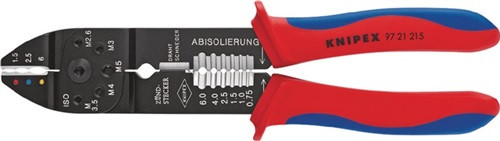 zum Kabelschneiden, Abisolieren von Drähten und Quetschen von isolierten und unisolierten Kabelschuhen und Steckverbindern und offenen Stechverbindern · mit Gewindelöchern zum Abschneiden von Cu- und Ms-Gewindestiften M 2,6 - M 3 - M 3,5 - M 4 - M 5 · aus hochfestem Spezialstahl Zange schwarz lackiert · Griffe mit 2-Komponenten-Hüllen